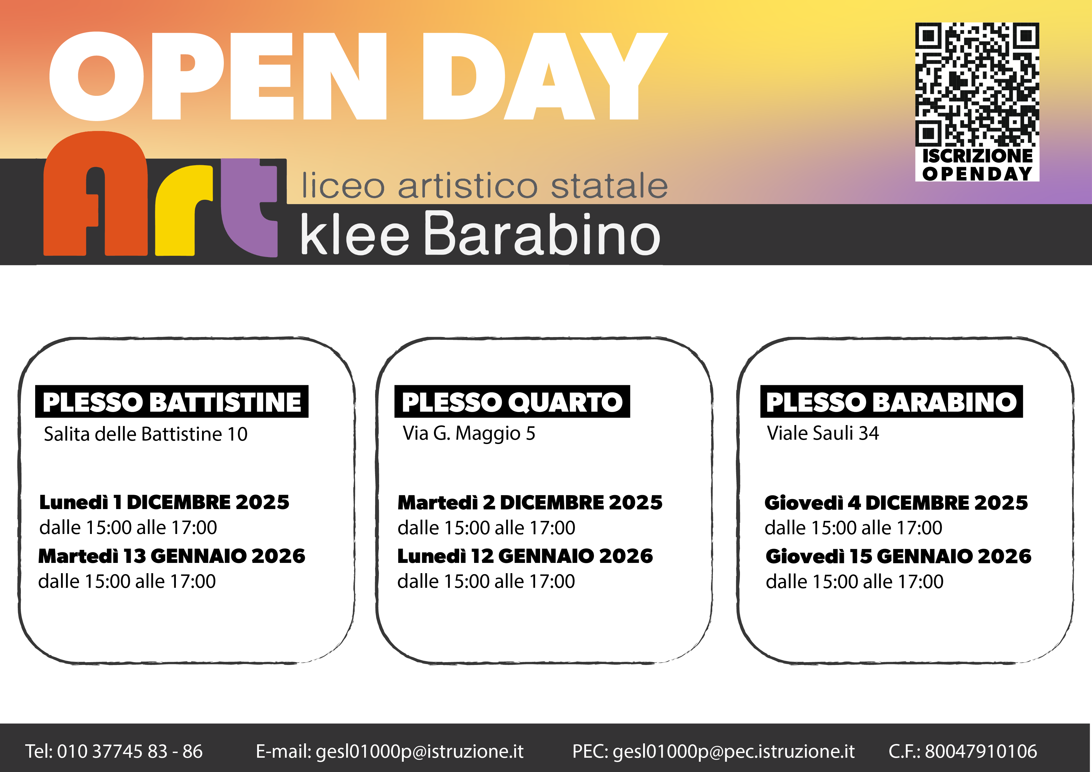 - Via G. Maggio 5, Quarto: martedì 2 dicembre 2025 e lunedì 12 gennaio 2026. Orario: 16.00-18:00